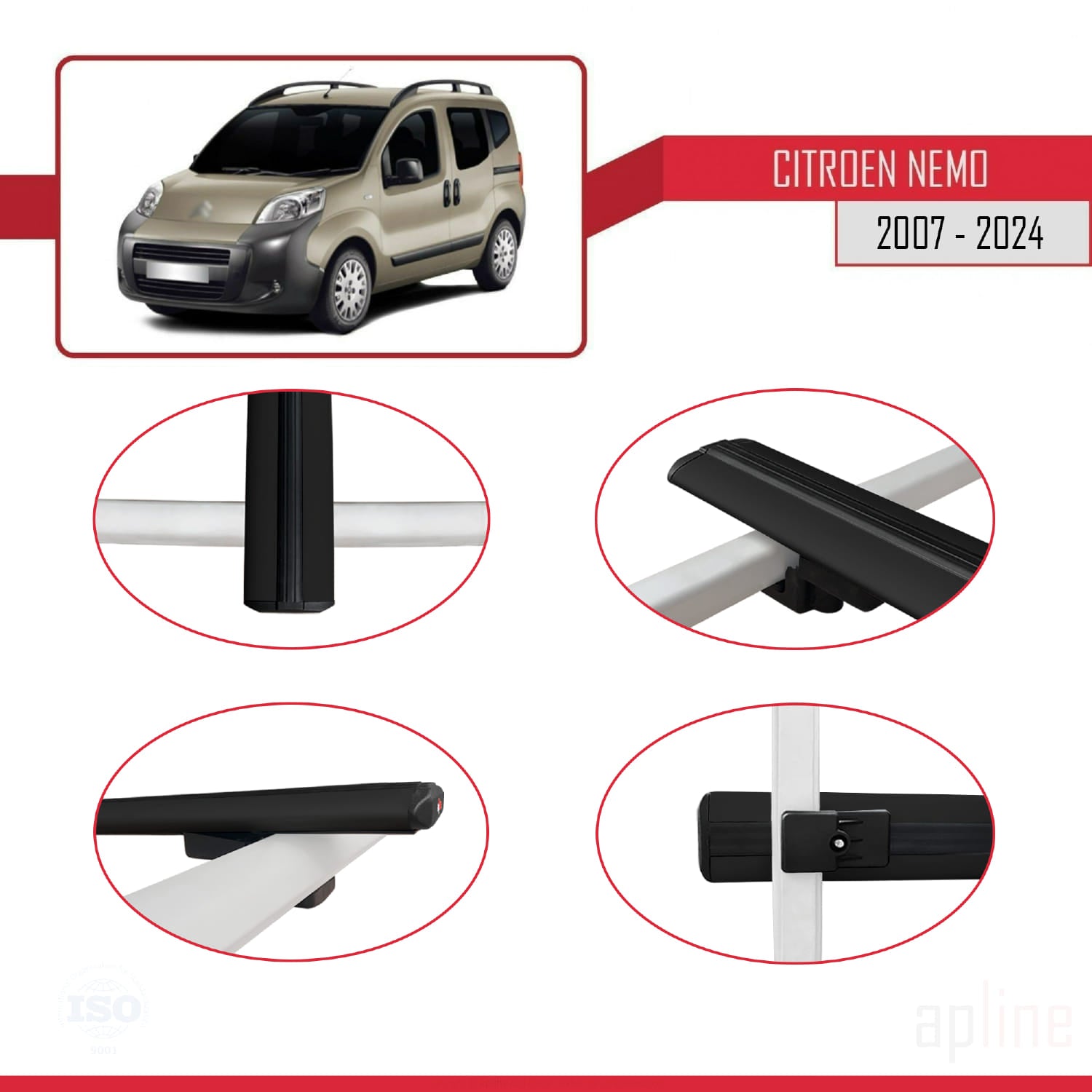 Compatible avec Citroen Nemo 3 (225) 2007-2024 BASIC Model Barres de Toit Railing Porte-Bagages de Voiture Noir Aluminium 2 Barres