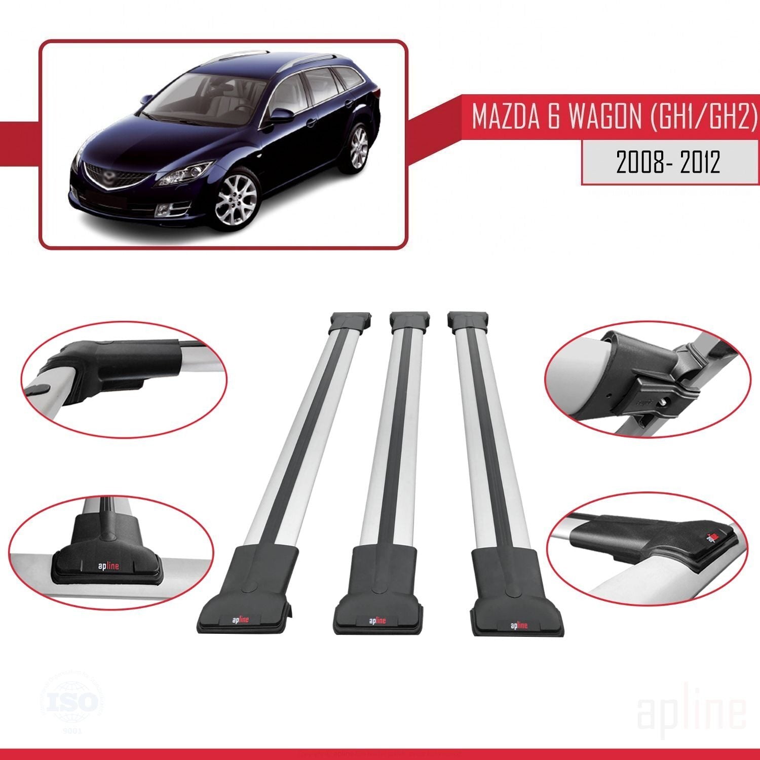 Compatible avec Mazda 6 II (GZ) Wagon 2008-2012 FLY Model Barres de Toit Railing Porte-Bagages de Voiture Gris Aluminium 3 Barres