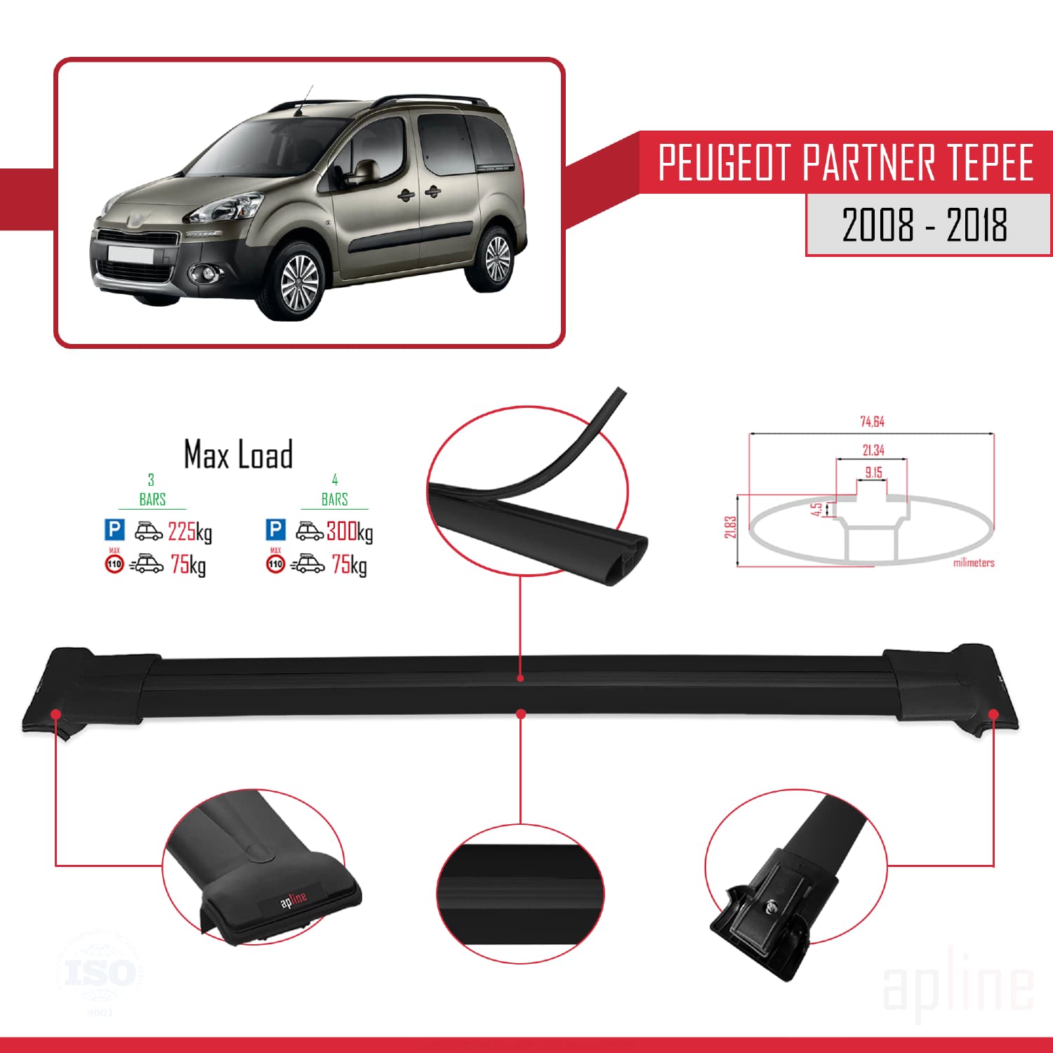 Compatible avec Peugeot Partner 2 Tepee 2008-2018 FLY Model Barres de Toit Railing Porte-Bagages de Voiture Noir Aluminium 4 Barres
