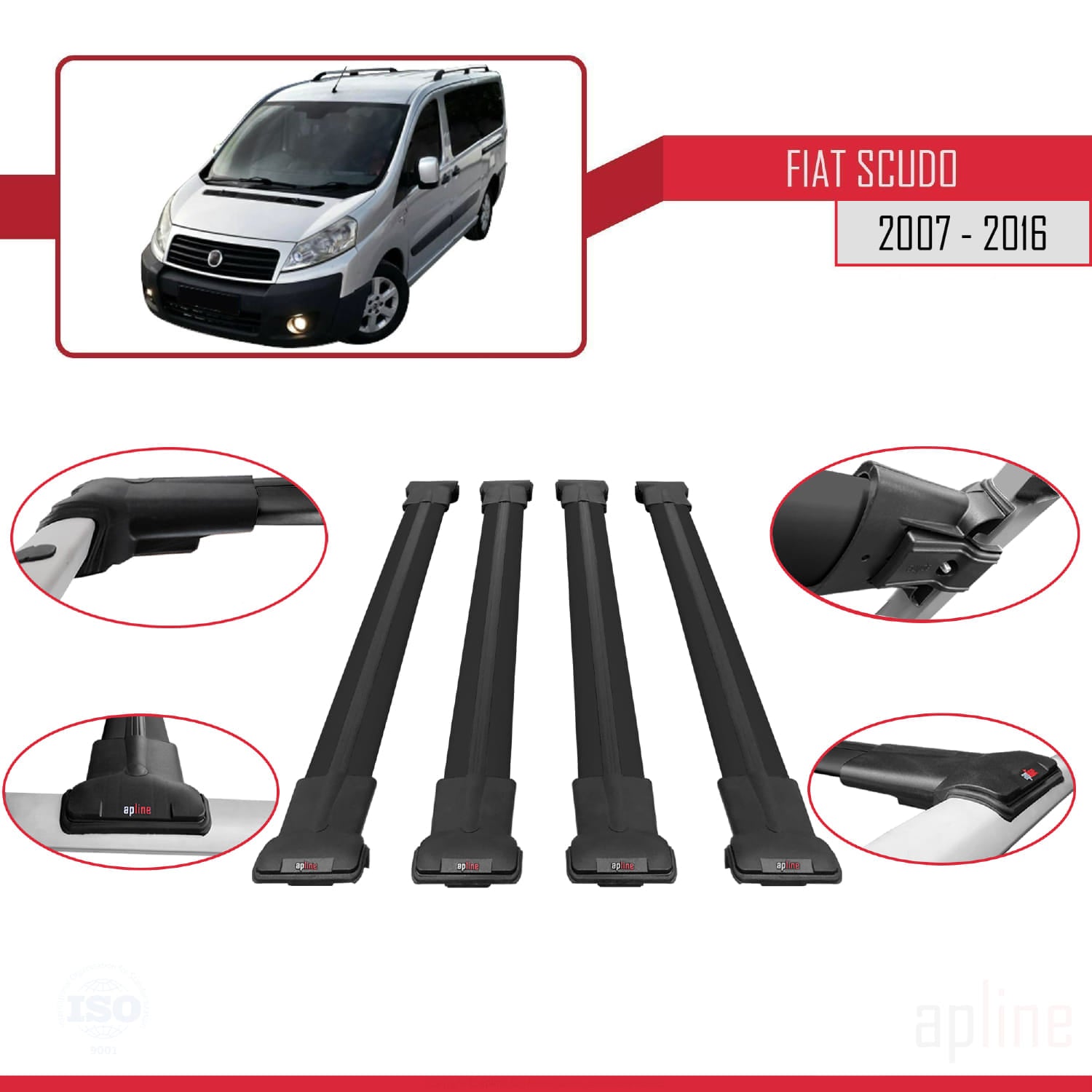 Compatible avec Fiat Scudo 2 2007-2016 FLY Model Barres de Toit Railing Porte-Bagages de Voiture Noir Aluminium 4 Barres