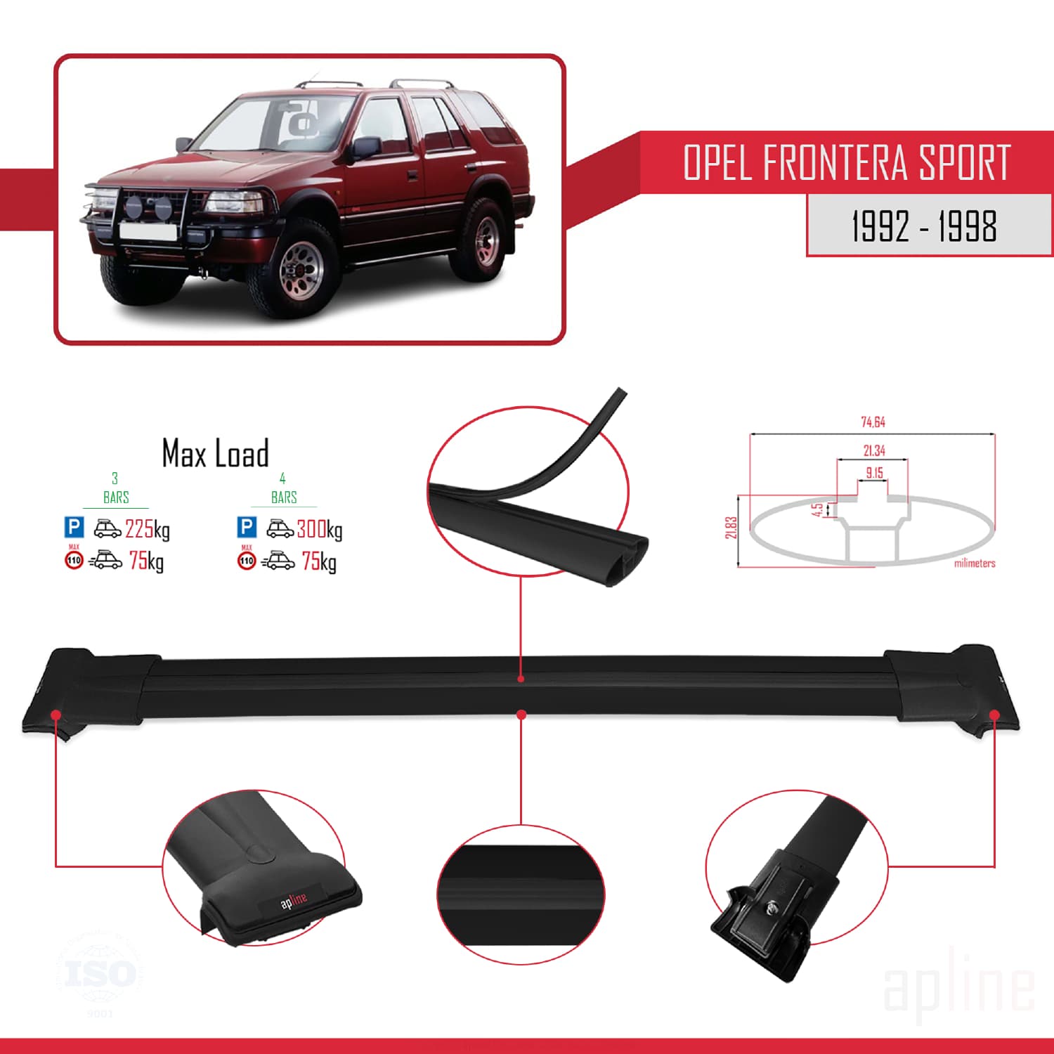 Kompatibel mit Opel Frontera Sport 1992-1998 FLY Model Relingträger Dachträger Auto Gepäckträger Schwarz Aluminium 3 Stangen
