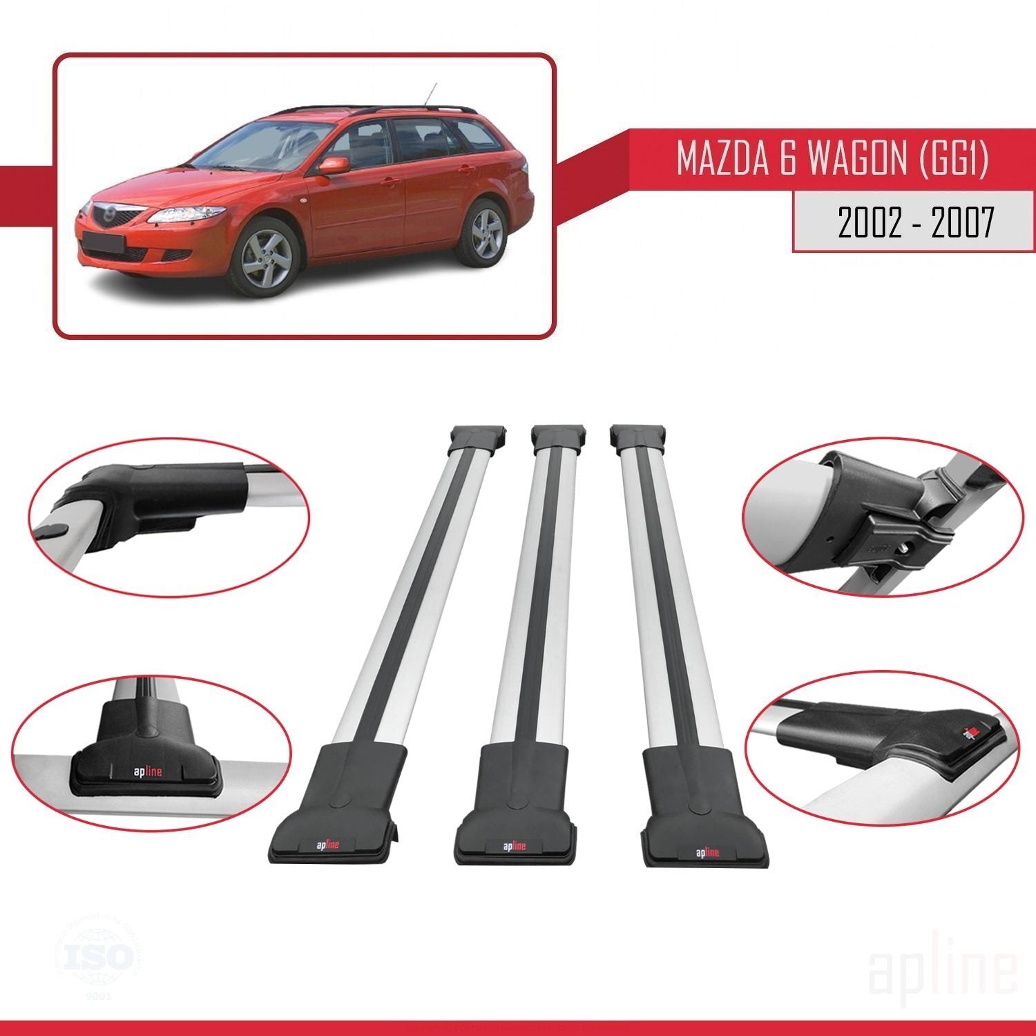 Compatible avec Mazda 6 I (GG1) 2002-2007 FLY Model Barres de Toit Railing Porte-Bagages de Voiture Gris Aluminium 3 Barres