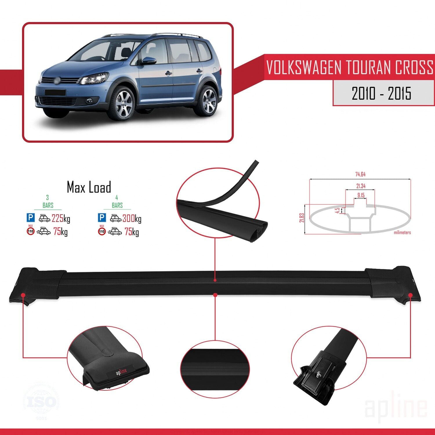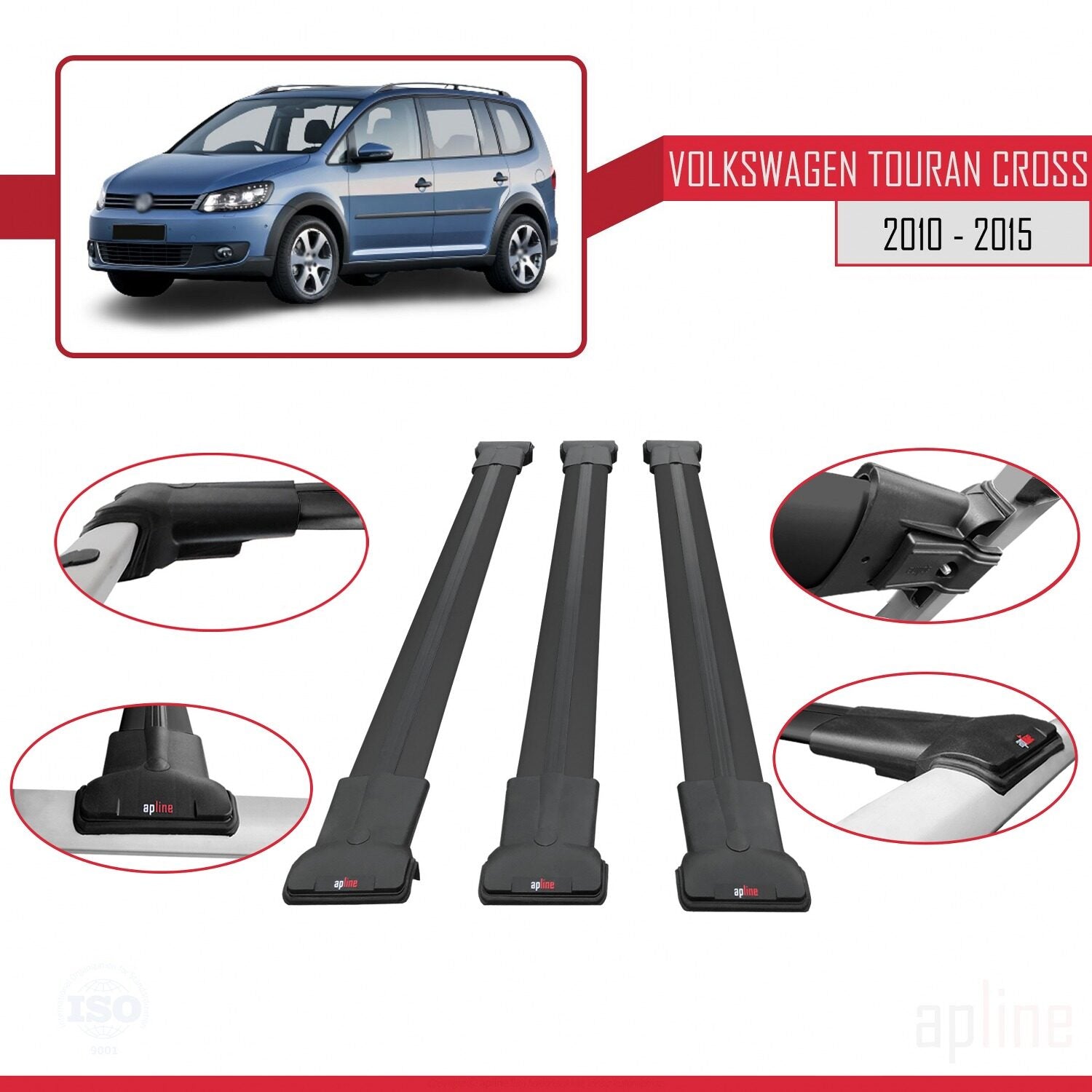 Compatible con Volkswagen Touran Cross Post-Facelift 2010-2015 FLY Model Barras de Techo Auto Portaequipajes Barras Transversales Negro Aluminio 3 Barras