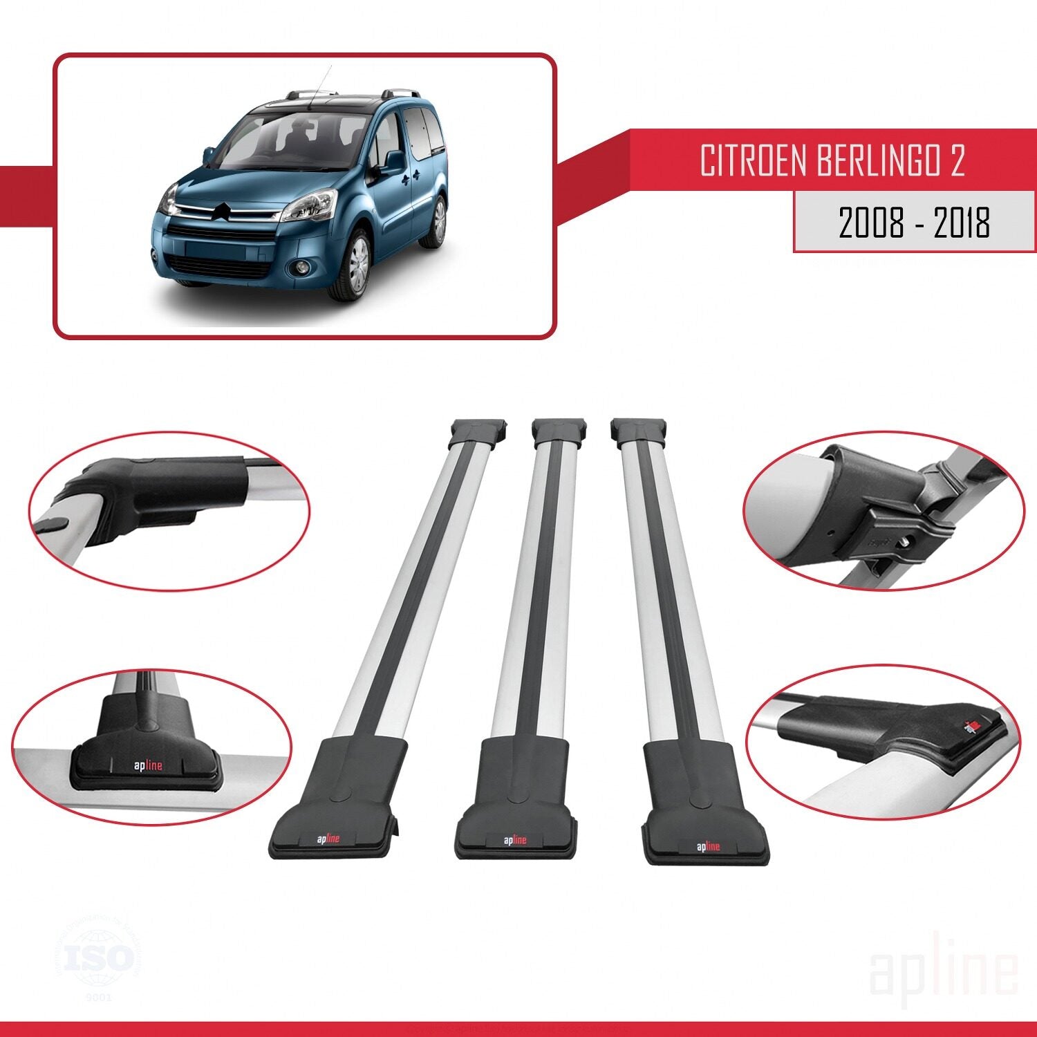 Compatible avec Citroen Berlingo 2 (B9) 2008-2018 FLY Model Barres de Toit Railing Porte-Bagages de Voiture Gris Aluminium 3 Barres