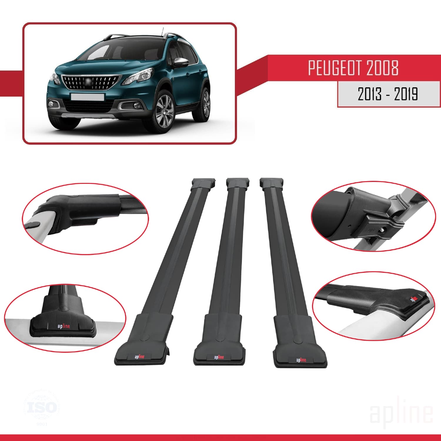 Compatible avec Peugeot 2008 (A94) 2013-2019 FLY Model Barres de Toit Railing Porte-Bagages de Voiture Noir Aluminium 3 Barres