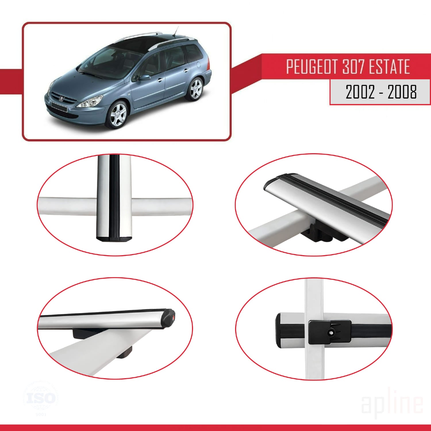 Compatible avec Peugeot 307 Break 2002-2008 BASIC Model Barres de Toit Railing Porte-Bagages de Voiture Gris Aluminium 2 Barres