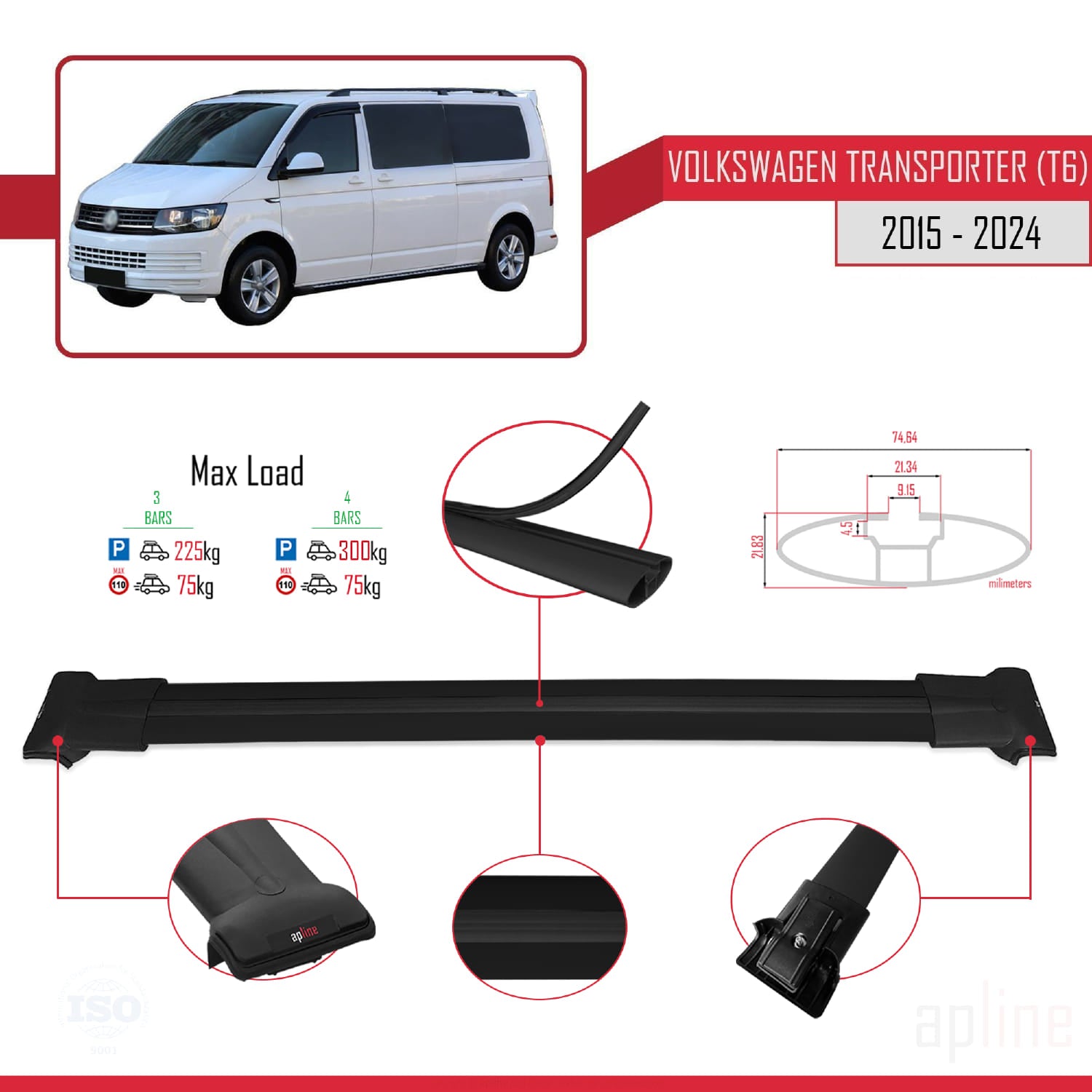 Compatible avec Volkswagen T6 Transporter 2015-2024 FLY Model Barres de Toit Railing Porte-Bagages de Voiture Noir Aluminium 4 Barres