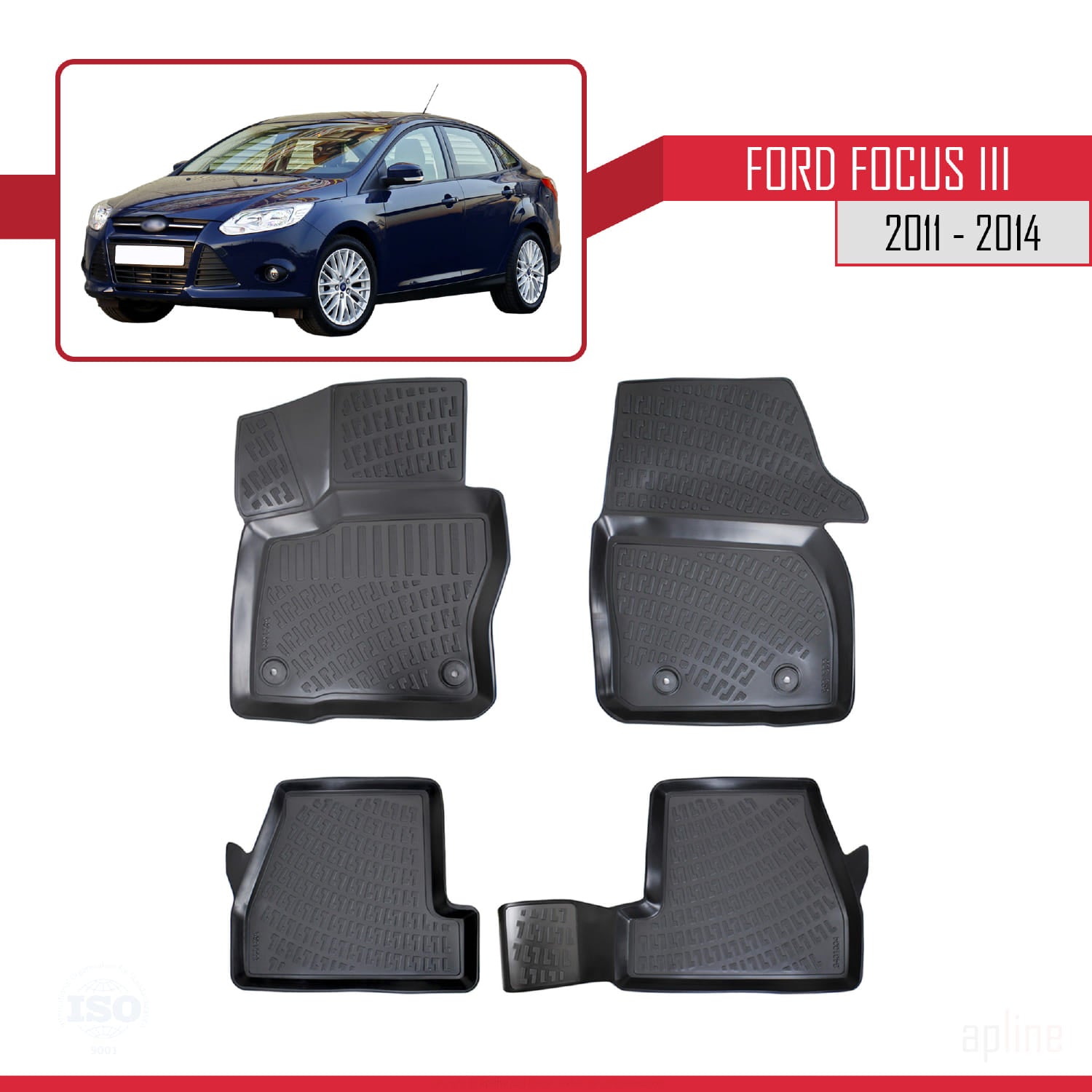 Compatibile con Ford Focus 3 (C346) Pre-Facelift 2011-2014 4D Tappeti in Gomma Nero