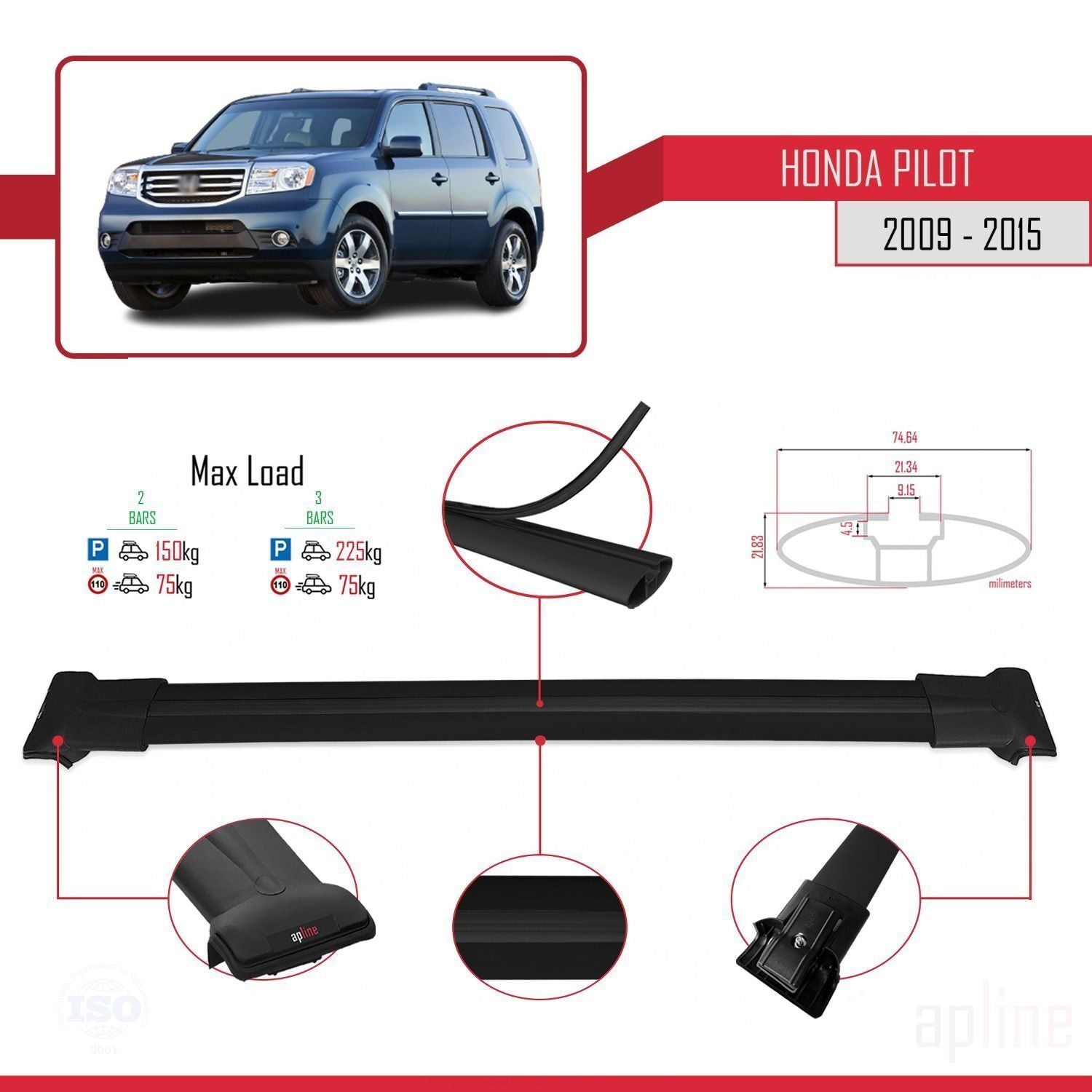Compatible avec Honda Pilot 2 2009-2015 FLY Model Barres de Toit Railing Porte-Bagages de Voiture Noir Aluminium 2 Barres
