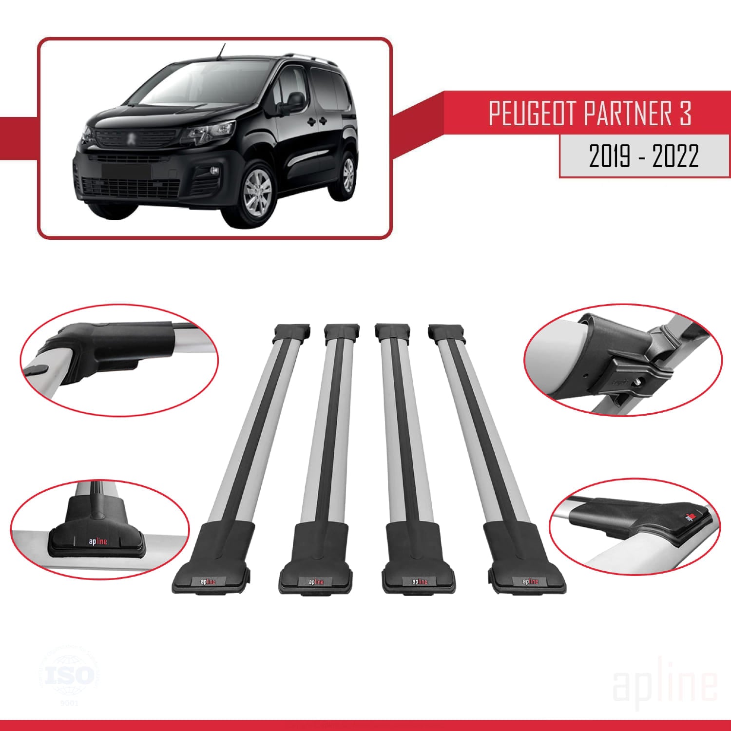 Compatible avec Peugeot Partner 3 2019-2022 FLY Model Barres de Toit Railing Porte-Bagages de Voiture Gris Aluminium 4 Barres