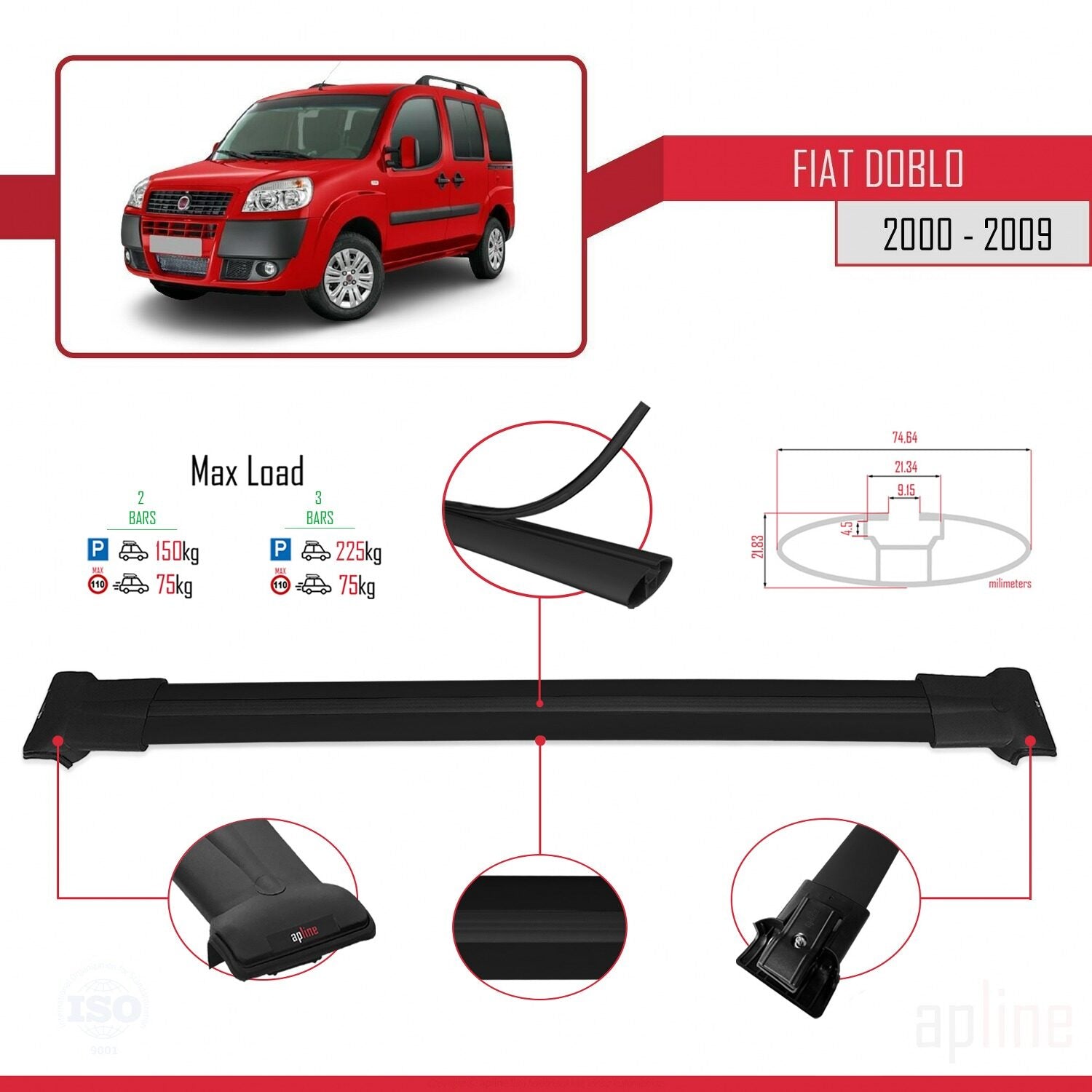 Compatible avec Fiat Doblo 2000-2009 FLY Model Barres de Toit Railing Porte-Bagages de Voiture Noir Aluminium 2 Barres
