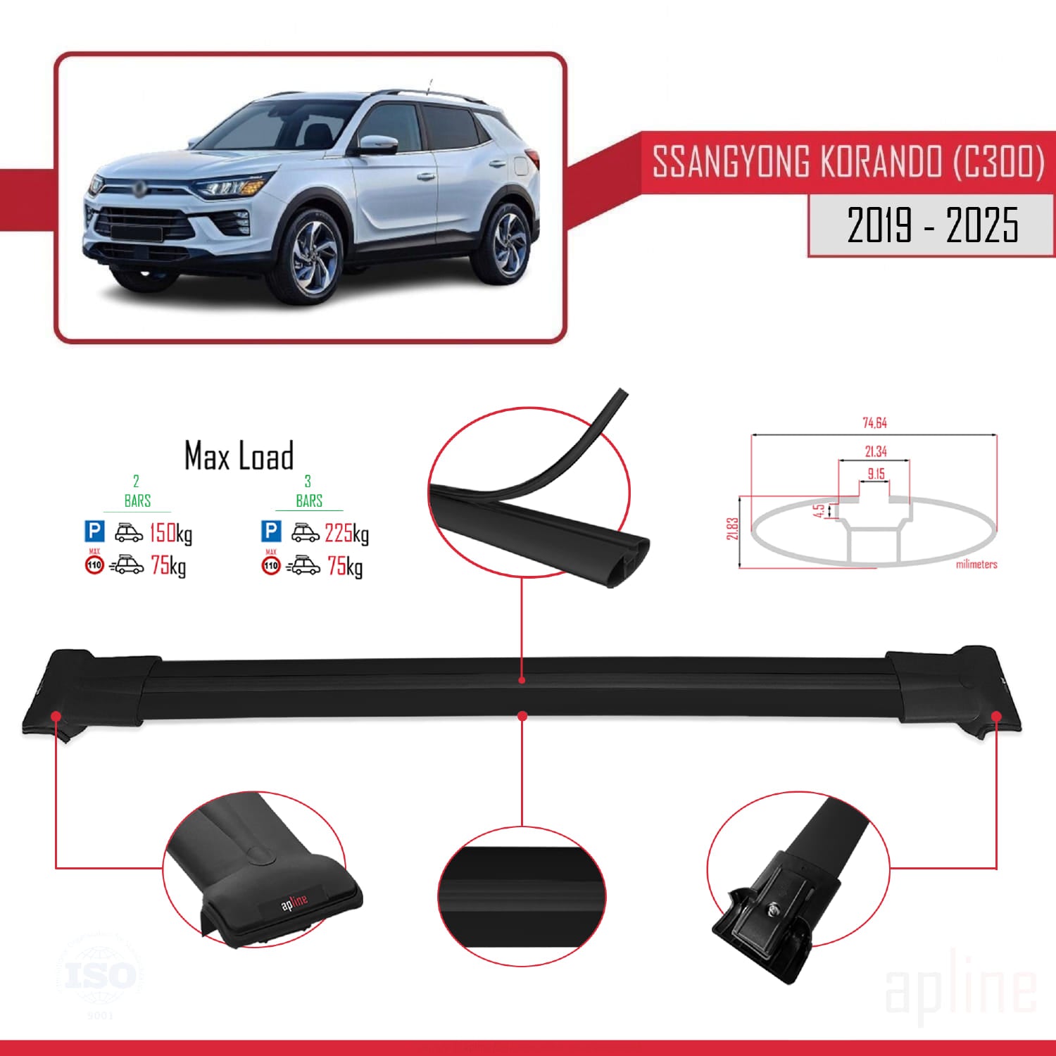Compatible avec Ssangyong Korando 4 (C300) 2019-2025 FLY Model Barres de Toit Railing Porte-Bagages de Voiture Noir Aluminium 2 Barres